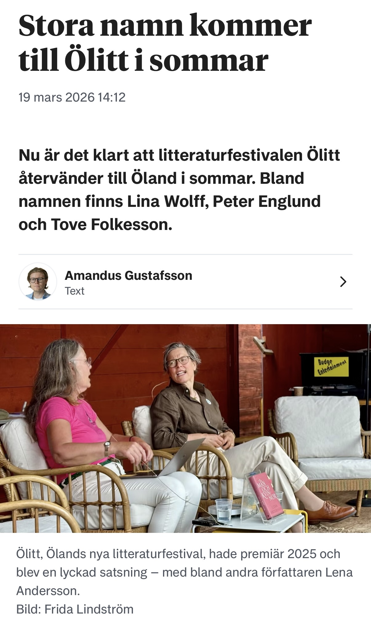 Barometern skriver bland annat att ”Förra sommaren hade Ölitt, en litteraturfestival arrangerad av Ölands litterära förening, premiär. Dit kom författare som Lena Andersson och John Ajvide Lindqvist och satsningen beskrevs som en succé av Barometerns-OT:s recensent.”